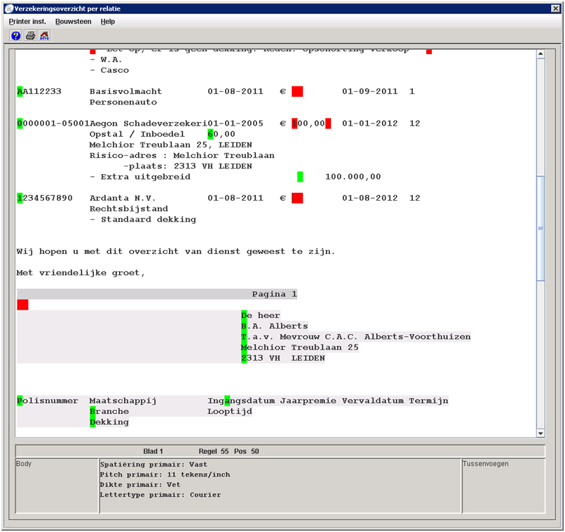 Als in het formulier bodyblok 61 Per relatie de geselect. polissen wordt opgenomen, worden binnen een bepaald niveau alleen de pakketten, polissen en dekkingen afgedrukt die voldoen aan de criteria binnen de selectie. In het bodyblok kunnen naar wens de juiste bouwstenen worden gevuld (Relatie, Pakket, Polis, Dekking).
