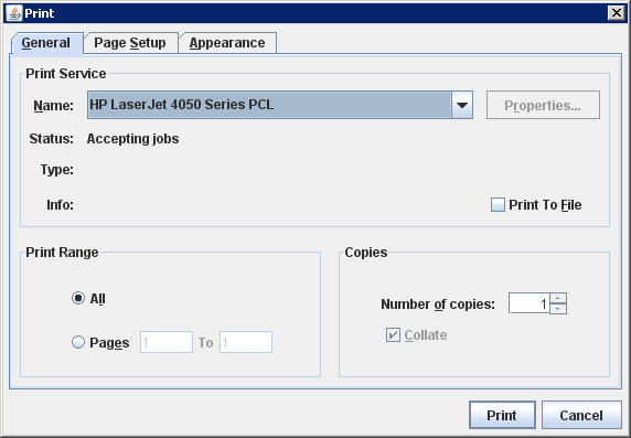 Het formulier wordt op de gekozen printer afgedrukt. In het veld Printer kunt u met Info kiezen uit de beschikbare printers. Als u voor het eerst een (Windows)printer invult voor een formulier van een bepaalde soort, verschijnt het venster Print waarin u verschillende printerinstellingen kunt doen.