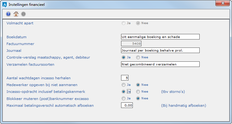 Vul, indien gewenst, een bedrag in bij Maximaal betalingsverschil automatisch afboeken. Het hier ingevoerde bedrag geldt alleen bij handmatige afgeboekte bedragen in pad FFA.