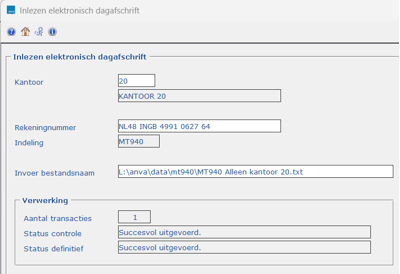Let op De boekstuknummering in ANVA dient gelijk te zijn aan het afschriftnummer van het MT940- of camt.053-bestand. Dit is noodzakelijk voor het goed kunnen verwerken van het bestand.