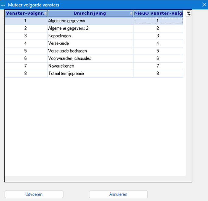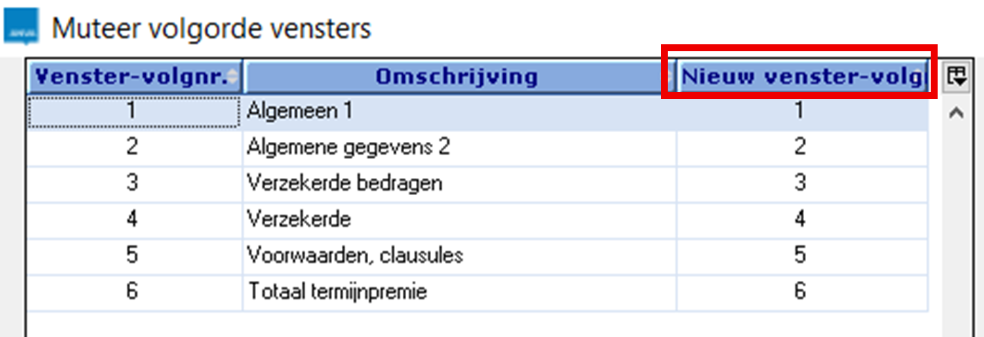 In de linker kolom Venster-volgnr staat de huidige volgorde.