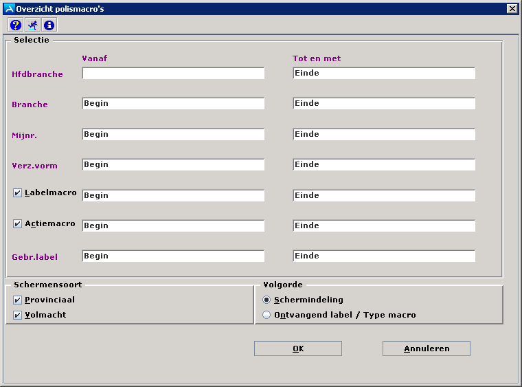 Als u deze opties aangevinkt laat staan, kies dan in de labels het begin en het einde van een serie. Als u niets invult, worden alle macro's op deze onderdelen in het overzicht meegenomen. |
