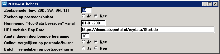 Aan de hand van parameters bepaal je hoe het systeem Roy-Data bevraagt. Je bepaalt hier onder andere de zoekperiode, de manier van zoeken en vanaf wanneer het systeem een herinnering geeft om Roy-Data te bevragen.