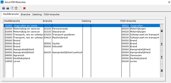 Voor een juiste communicatie met FISH moet je een ANVA-hoofdbranche, -branche en -dekking koppelen aan een FISH-branchecodering. Bij het gebruik van FISH wordt dan automatisch de juiste FISH-branche opgehaald uit de tabel en ingevuld.