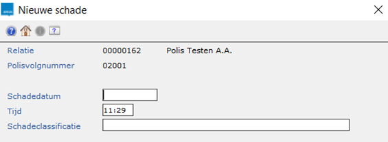 - Vul in het venster Nieuwe schade de schadedatum in. Afhankelijk van de instellingen in pad BYSS deel VII wordt de tijd wel of niet automatisch gevuld met de systeemdatum.