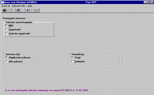 Definitief Hiermee wordt de Interface definitief over de selectie van ANVA geschreven. Deze draai je als de belangrijkste maatschappijgegevens overeenkomen met die van de gegevens in ANVA. Na de definitieve interface kun je géén proefinterface meer draaien. Als de melding 'Geen interfacegegevens' ‘Geen polisgegevens’ nog niet is opgelost, gaan de gegevens van deze polis verloren (er is geen polis in de selectie om de gegevens naartoe te schrijven).