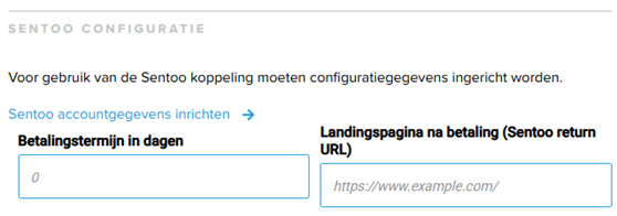 Voer bij Landingspagina na betaling (Sentoo return URL) de URL in van de landingspagina waar de relatie terechtkomt na de betalingstransactie in Sentoo. Hier staat het antwoord van de Sentoo API. Deze moet overeenkomen met de hostname op Sentoo.
