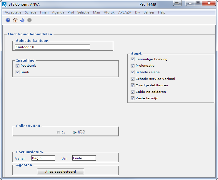Met menu Alles roep je alle factuurgegevens van de relatie op, zowel de actuele als de historische gegevens. Ook boekingen als bijvoorbeeld de provisieboeking zie je in dit menu. |