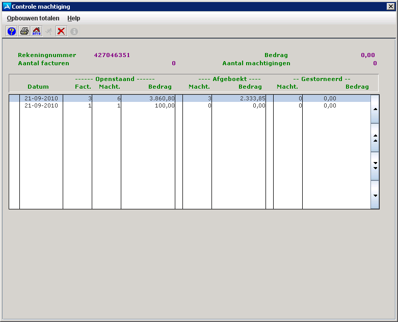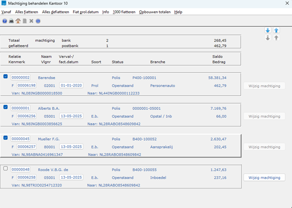 Op de lijst staan verder de ingegeven referentie en de automatisch toegekende afboekwijze (vast) en boekstuk (variabel). Deze gegevens worden in de gegenereerde betalingen opgenomen.