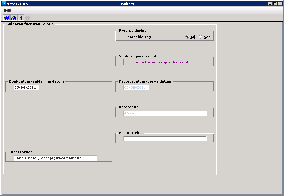 Geef aan of je al dan niet een proefsaldering wilt maken. Als je voor Ja kiest, wordt nog geen saldofactuur gemaakt, maar een lijst aan de hand waarvan je de saldering kunt controleren. Als je twijfelt, maak dan eerst een proefsaldering. Als de proefsaldering in orde is, voer je de definitieve saldering uit. |