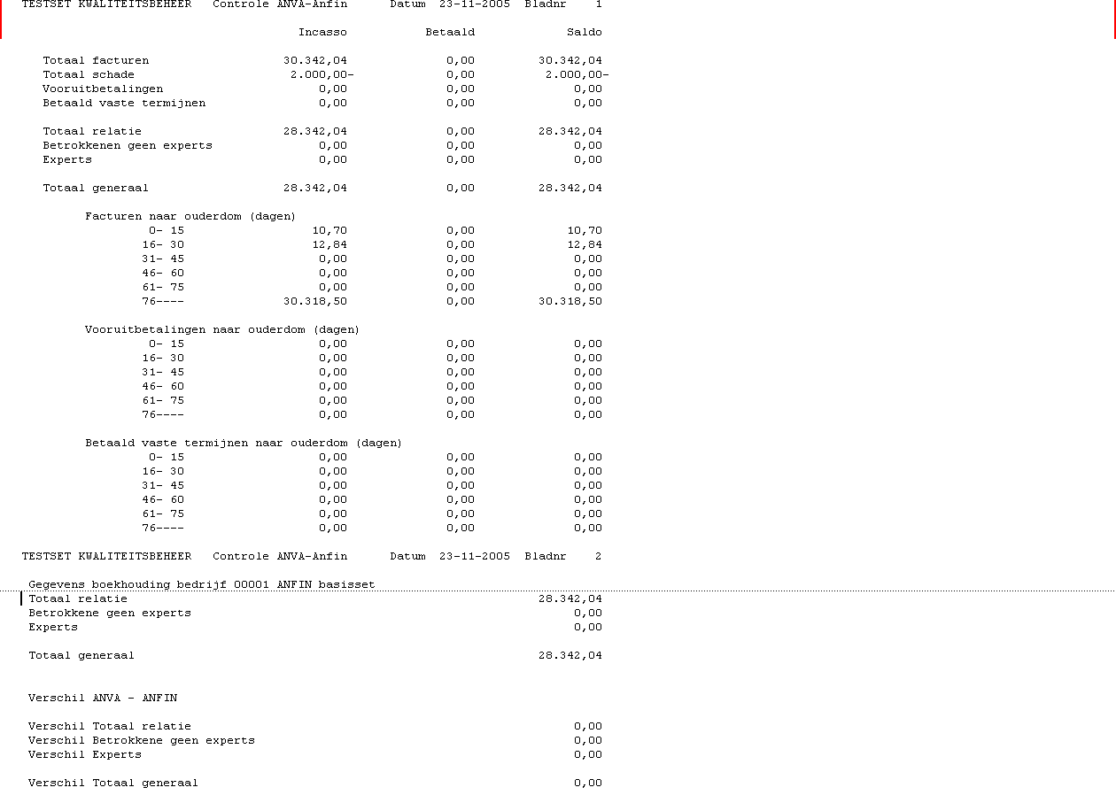 Notitie - Draai voor een juiste vergelijking tussen het openstaande saldo met ANFIN zowel de financiële verwerking voor eenmalige boekingen, prolongatie, schade en overige debiteuren als ANVA journaliseren. - De subadministratie moet altijd aansluiten op de saldo administratie. Controleer daarom regelmatig (dagelijks) of de debiteuren, betrokkenen en experts uit de subadministratie overeenkomen met het saldo in ANFIN. - Zoek verschillen tussen de subadministratie in ANVAen de grootboekadministratie onmiddellijk uit en los ze op. Als de verschillen zijn ontstaan als gevolg van storing van de hard- of software, kunnen wij je van dienst zijn als je ANVA Customer Support onmiddellijk waarschuwt.