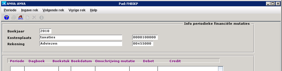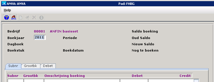 Kies met Info op welk dagboek de boeking het grootboek binnenkomt. U kunt alleen boeken op dagboeken waarbij in pad FHAA aangegeven is, dat hier handmatig op geboekt mag worden. Als dit niet het geval is krijgt u de melding: 'Op dit dagboek mag niet geboekt worden'. Als u op [Enter] drukt verschijnt het volgende veld. Er mag niet op dagboeken geboekt worden die aan ANVA zijn gekoppeld.