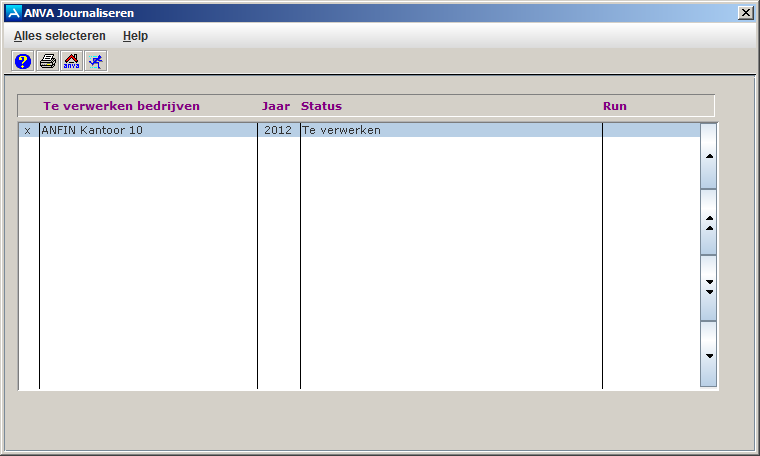 Let op De journaalregels van alle jaren moeten worden verwerkt, anders krijg je later in de jaarprocedure alsnog de melding dat ANVA journaliseren eerst nog gedraaid moet worden. Maak je geen gebruik van ANFIN maar van een extern boekhoudprogramma, dan kun je via pad FE journaliseren. Raadpleeg 'Journaliseren van de boekingen (extern pakket)' voor meer informatie.