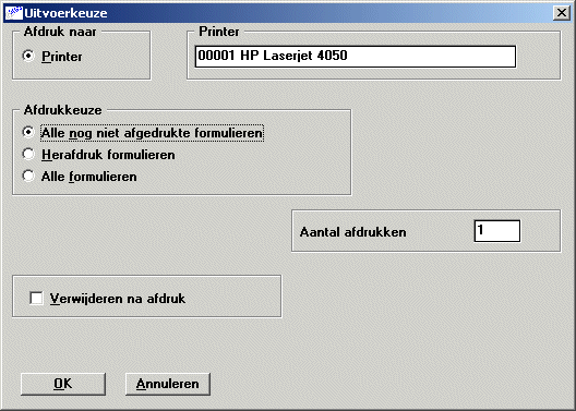 Kies hier bij voorkeur voor Nee. Verwijder de afgedrukte formulieren pas als ze goed zijn afgedrukt. Kiest u voor Ja dan worden de formulieren direct na het afdrukken automatisch verwijderd. |