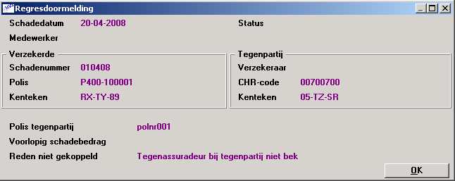 Notitie Als een schade niet aan de eisen voor een regresmelding voldoet, wordt in een melding getoond welk(e) gegeven(s) in het betreft in het schadedossier. Voor de schade wordt dan geen regresmelding aangemaakt en u keert terug naar het schadedossier.