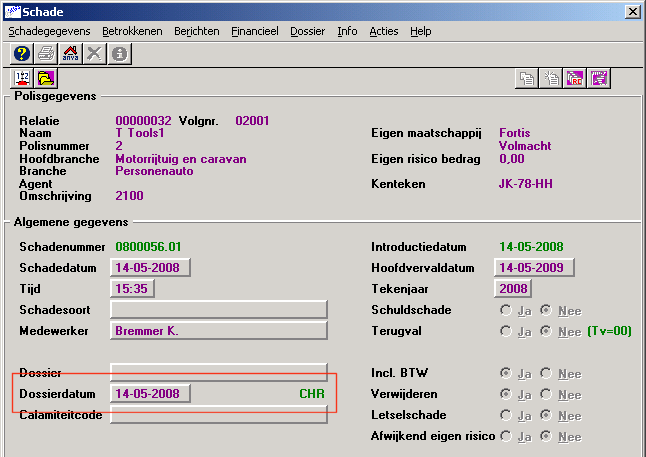 Notitie U kunt het schadedossier ook oproepen via menu Schade - Bestaande schade. Zie Algemene schadegegevens oproepen.