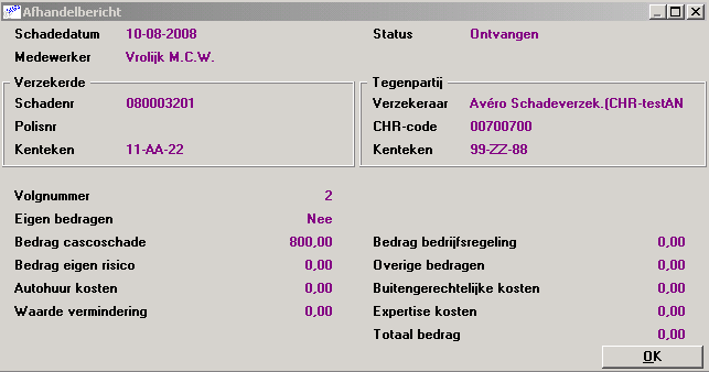 'Er is een afhandelbericht met bedragen van de tegenassuradeur ontvangen op [dd-mm-jjjj] met een totaalbedrag van [xxx,xx].