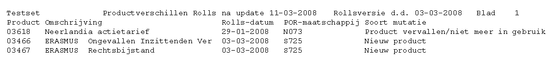 Het updaten van de producten wordt automatisch uitgevoerd als een gebruiker inlogt die Rolls lokaal heeft geïnstalleerd. Dit gebeurt nadat de dagelijkse controle van bestanden is afgerond. Bij het ophalen van de producten bij het inloggen van de eerste gebruiker die dag, worden alleen de producten getoond die nieuw zijn toegevoegd of die zijn vervallen. Als in de bestaande set producten (tarieven) niets is veranderd, wordt er ook geen overzicht afgedrukt. Voorbeeld van een overzicht met verandering van de Rolls-producten in ANVA: