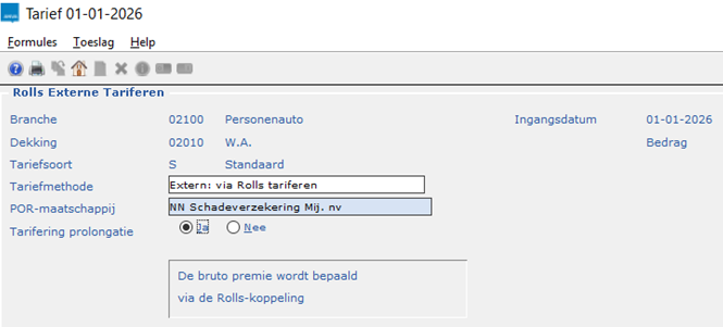 Als er polissen zijn met een tarief in de dekking(en) dat extern wordt getarifeerd zal er voor het prolongeren eerst extern moeten worden getarifeerd via pad RX, zie Extern tariferen voor prolongatie (Rolls).