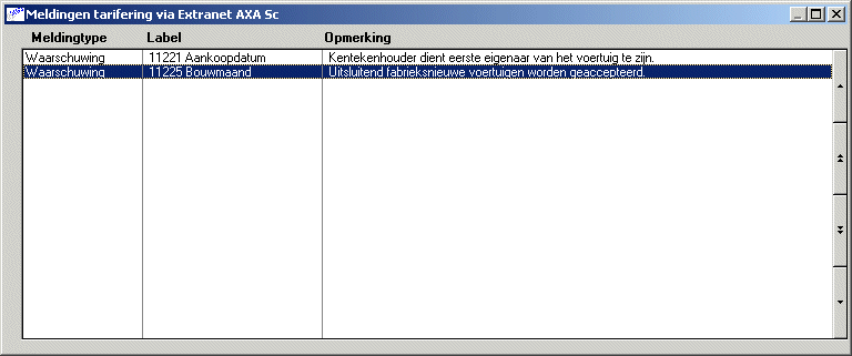 Het kan ook voorkomen dat een waarschuwing volgt. Een waarschuwing houdt de tarifering niet tegen. Een waarschuwing geeft aan dat er gegevens in de polis staan die afwijken van de standaard Acceptatie zoals in Rolls bij deze maatschappij bekend is.