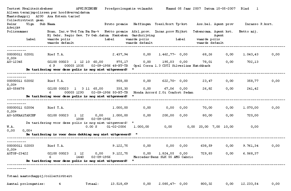 Op het proefprolongatieverslag wordt nogmaals vermeld dat de tarifering voor de polissen niet is uitgevoerd.