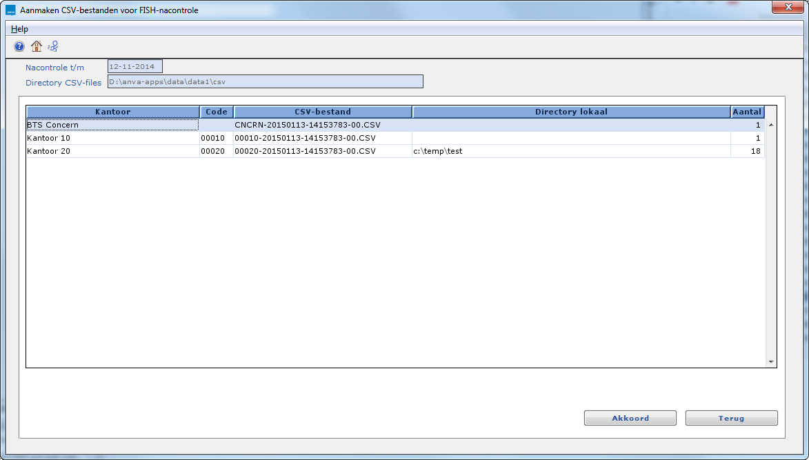 In venster Aanmaken CSV-bestanden voor FISH-nacontrole zie je voor welke kantoren er FISH Extract-nacontroles uitgevoerd moeten worden. Afhankelijk van de inrichting worden er één of meer aan te maken CSV-bestanden getoond.