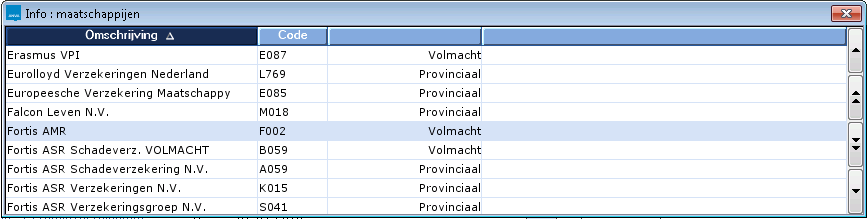 Afhankelijk van de manier waarop dit in menu Beheer is ingesteld, krijg je de Info-tabel op volgorde van code of op omschrijving gesorteerd. Door op de knoppen Omschrijving of Code te klikken of door gebruik te maken van de functietoets [F5] kan je wisselen tussen deze sorteerwijzen. Als de sorteerwijze Omschrijving gebruikt wordt, kan je zoeken op de omschrijving van de gegevens. Als de sorteerwijze Code gebruikt wordt, kan je zoeken op de code van de gegevens.