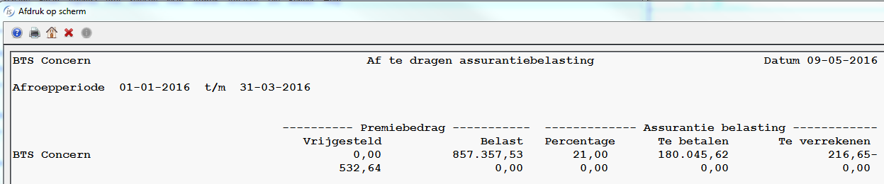 Deze post komt op het volgende overzicht voor: Uitgebreid. De geboekte assurantiebelasting. Dit bedrag is de waarde van label 93046 Assurantiebelasting factuur. Als er assurantiebelasting provinciaal wordt geboekt, komt het wel in de omzet, maar hoeft het niet afgedragen te worden. De assurantiebelasting wordt voor provinciale boekingen afgedragen door de maatschappij. |