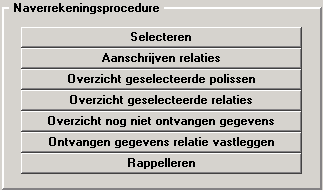De module Naverrekenen is in eerste instantie bedoeld voor volmachtpolissen. Voor provinciale polissen kan echter ook een aanschrijvingsbrief worden verstuurd, gegevens worden vastgelegd en een brief met deze gegevens aan de maatschappij gestuurd. Voor provinciale polissen kan het rekenen niet worden uitgevoerd omdat de gegevens daarvoor niet beschikbaar zijn. De procedure voor naverrekenen bestaat uit (voor volmachtposten) uit de volgende stappen: