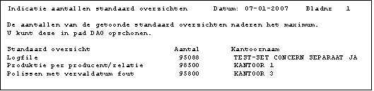 Bij het voor de eerste keer inloggen op een dag door een Beheerder, wordt een overzicht gegenereerd en direct op scherm getoond. Het betreft het overzicht ‘Indicatie aantallen standaard overzichten’.
