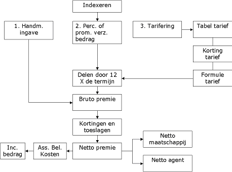 De in dit onderdeel beschreven structuur start bij de berekende premie uit de dekking van de polis ( = bruto premie).