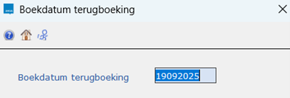 Als in BYSF de Boekdatum op 1 Uit eenmalige boeking en schade staat, kan de boekdatum van de terugboeking worden aangepast. Bij het terugdraaien van de prolongatiefacturen verschijnt dan het scherm Boekdatum terugboeking.