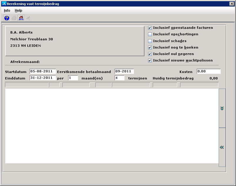 In ANVA zal bij het sluiten van een nieuwe polis in rekening-courant of een mutatie met premieconsequenties op een rekening-courantpolis, bij vervolgacties de optie Berekenen vaste termijn verschijnen. U komt dan automatisch in het venster waarin de rekengegevens voor het vaste termijnbedrag zijn opgenomen. De berekening is ook handmatig op te starten in het relatiescherm via Acties – Ber. vaste termijn.