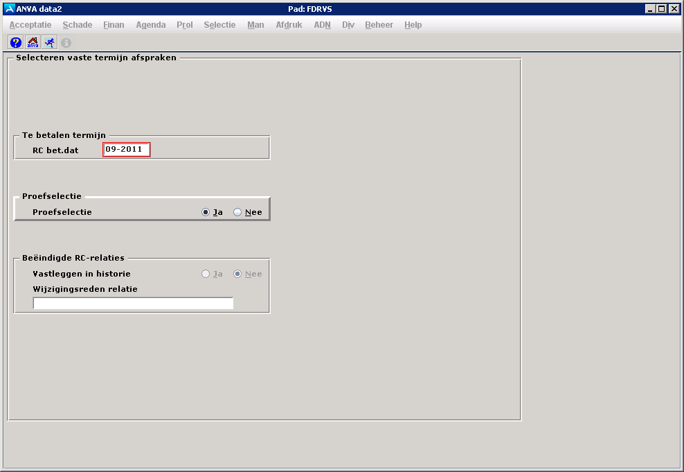 De maand en het jaar waarin de relatie zijn/haar rekening-courant wil beëindigen. Bij het selecteren van de termijnen (pad FDRVS) wordt aan de hand van dit label gekeken welke relaties hun rekening-courant willen beëindigen. ANVA werkt aan de hand van deze datum automatisch de relatie bij, zodat de rekening-courant vanaf dat moment niet meer actief is (label 00016 Rekening-courant wordt op Nee gezet). Let op Einddatum 09-2005. Het termijnbedrag september 2005 wordt nog geïncasseerd. |