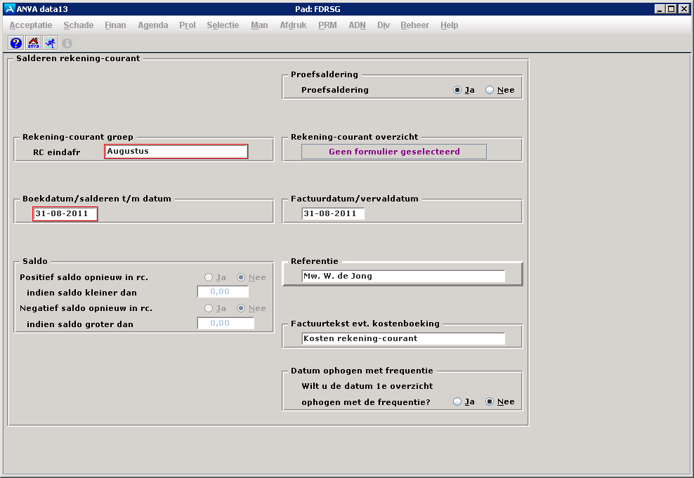Notitie Als u alleen bij de eindafrekening rekening-courantoverzichten maakt is het draaien van dit overzicht overbodig. Het proefsalderen via pad FDRS geeft dan hetzelfde overzicht.
