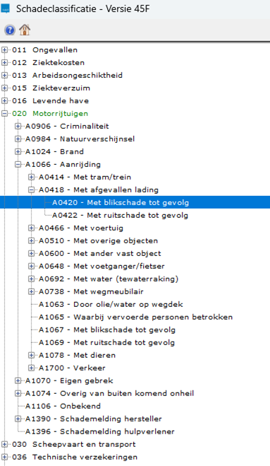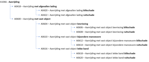Er is één code voor 'Aanrijding', drie coderingen voor 'Aanrijding met afgevallen lading' en tien coderingen voor 'Aanrijding met een vast object', o.a. met variaties De ene partij volstaat met vastlegging van 'Aanrijding met afgevallen lading' en kiest code A0418. Een andere partij wil daarnaast ook het soort schade vastleggen en kiest met code A0420 of de aanrijding met afgevallen lading blikschade tot gevolg had.