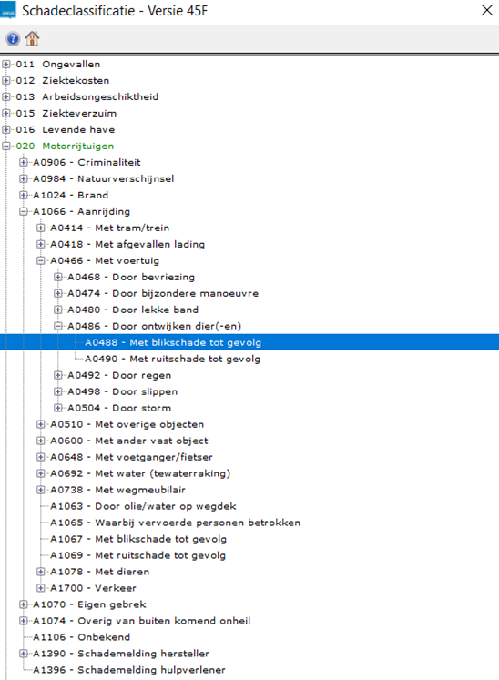 In een schade is in het scherm met de algemene schadegegevens label 91500 Schadeclassificatie (AFD) schadedos aanwezig, Hierin staat de SIVI-hiërarchietabel. Deze wordt bijgewerkt met iedere major release van ANVA 4/5 op basis van de actuele versie van het SIVI. |
