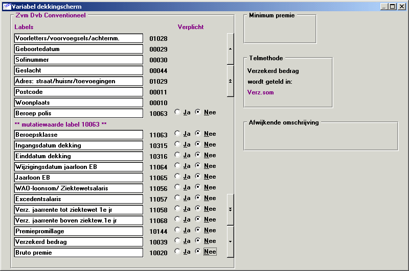 Labels 11074 en 61074 kennen vijf vaste coderingen: D, DV, P, PV en A. Met code D (dekking per werknemer) en DV (dekking per werknemer verplicht) kiest u voor model I en kunt u meerdere dekkingen met dezelfde code in de polis opnemen. Met code P (polis per werknemer) en PV (polis per werknemer verplicht) kiest u voor model II. Als eenmaal dekkingen en polissen aanwezig zijn kunnen de labels 11074 en 61074 niet meer worden gemuteerd van een code P naar een code D en vice versa.