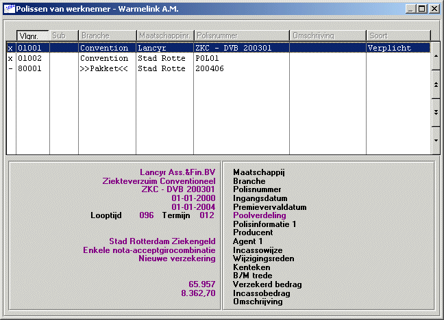 Via het polisoverzichtscherm van de werknemer kunt u een overzicht oproepen van de polissen van de aan de werknemer gekoppelde werkgever(s).